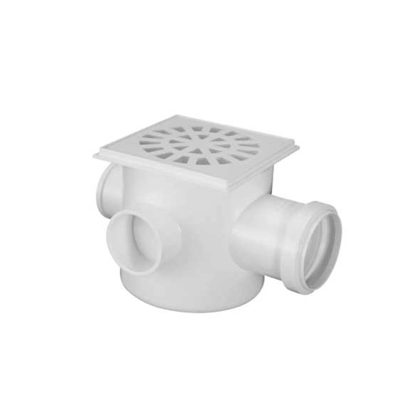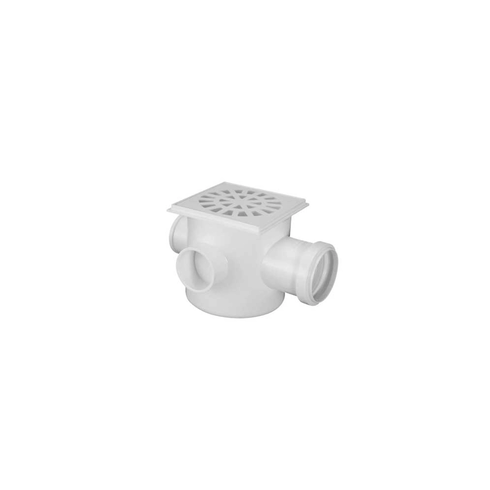 Caixa sifonada quadrada branca da Krona, modelo 904, projetada para sistemas de drenagem e esgoto. Com dimensões de 100x100x50mm, possui design robusto que retém água, detritos e resíduos de lavações de pisos e banheiros. Fabricada com materiais de alta durabilidade, garante vedação eficiente e instalação simples.