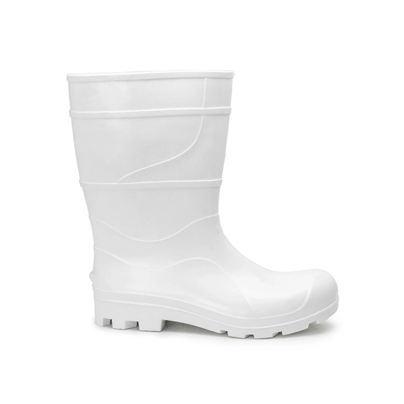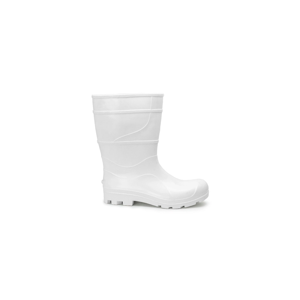 Calçado ocupacional tipo bota abaixo do joelho, constituída de policloreto de vinila (PVC), desenho do cabedal tipo (C), montagem sistema de injeção por extrusão, classificação (II – Inteiro polimérico) solado monodensidade com ressaltos, solado resistente à ação de óleo combustível. Região do salto totalmente fechada, com resistência ao escorregamento.