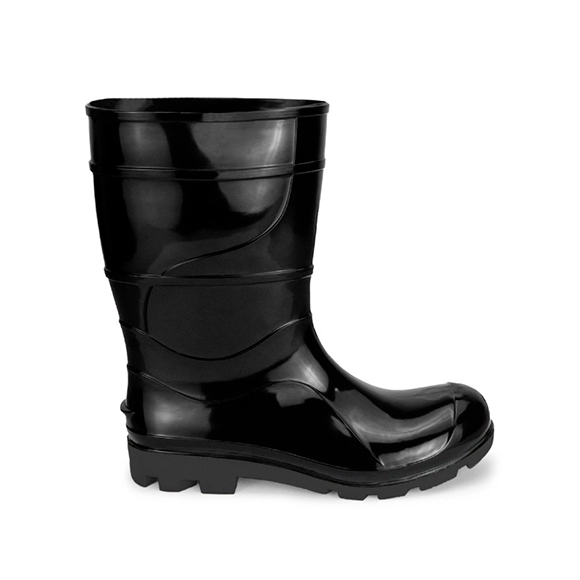 Calçado ocupacional tipo bota abaixo do joelho, constituída de policloreto de vinila (PVC), desenho do cabedal tipo (C), montagem sistema de injeção por extrusão, classificação (II – Inteiro polimérico) solado monodensidade com ressaltos, solado resistente à ação de óleo combustível. Região do salto totalmente fechada, com resistência ao escorregamento.