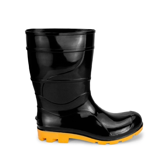 Calçado ocupacional tipo bota abaixo do joelho, constituída de policloreto de vinila (PVC), desenho do cabedal tipo (C), montagem sistema de injeção por extrusão, classificação (II – Inteiro polimérico) solado monodensidade com ressaltos, solado resistente à ação de óleo combustível. Região do salto totalmente fechada, com resistência ao escorregamento.