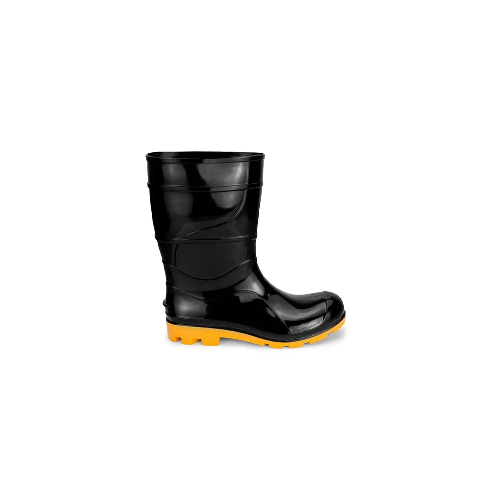 Calçado ocupacional tipo bota abaixo do joelho, constituída de policloreto de vinila (PVC), desenho do cabedal tipo (C), montagem sistema de injeção por extrusão, classificação (II – Inteiro polimérico) solado monodensidade com ressaltos, solado resistente à ação de óleo combustível. Região do salto totalmente fechada, com resistência ao escorregamento.