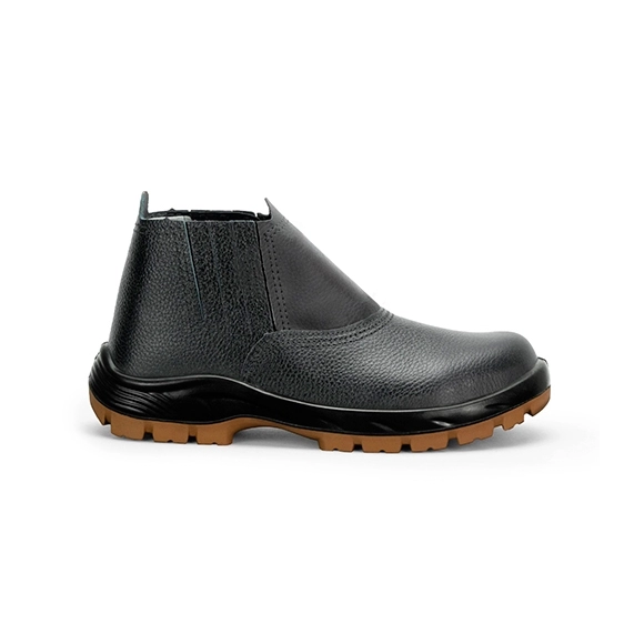 Botina de segurança com fechamento em elástico lateral recoberto confeccionado em couro vaqueta lisa, com forração interna na gáspea, forro do cano em nylon com tratamento antimicrobiano.