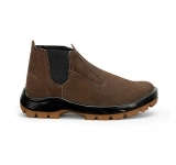 Calçado ocupacional tipo botina, confeccionado em couro nobuck na cor marrom, fechamento em elástico nas laterais, palmilha de montagem fixada pelo sistema strobel.