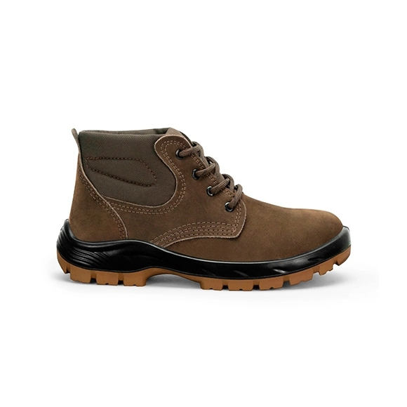 Botina de segurança com fechamento em cadarço recoberto confeccionado em couro nobuck na cor marrom, colarinho com forração interna, forro do cano em nylon com tratamento antimicrobiano.