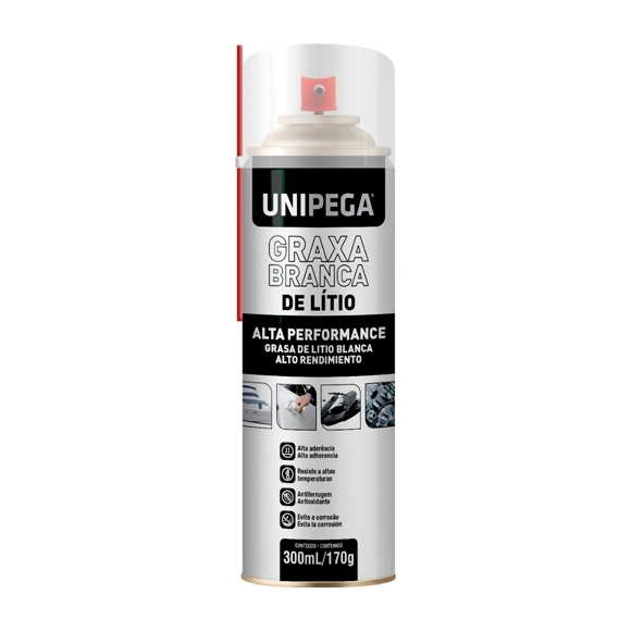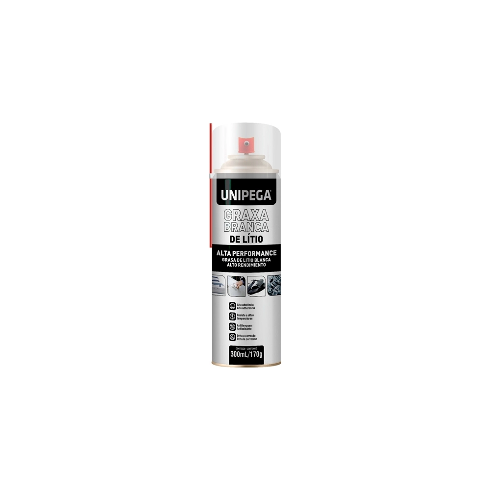 A Graxa Spray Branca Unipega 300ml é um lubrificante de alta aderência desenvolvido para proteger, reduzir o atrito e aumentar a durabilidade de peças móveis metálicas ou plásticas. Sua fórmula especial à base de graxa branca sintética forma uma película resistente que não escorre , oferecendo proteção contra umidade, ferrugem e corrosão .