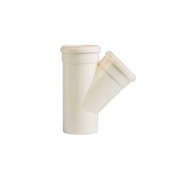 Junção para esgoto ideal para realizar a união entre dois trechos da rede em que a entrada se dê a 45° da linha onde a junção foi instalada, sem alteração de diâmetro.